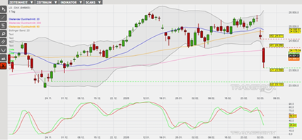 Ausgehend vom Verlaufshoch am 27. Februar bei 25.405 Punkten im überkauften Bereich über dem oberen Bollinger-Band ist der Index bis zum lokalen Minimum am 3. März bei 23.589 Punkten im überverkauften Bereich unterhalb des Bollinger-Bandes in nur drei Handelstagen um 1.816 Punkte eingebrochen. Diese Kursschwäche hat dazu geführt, dass derzeit der gleitende Durchschnitt der letzten 20, 50 und 200 Handelstage (= GD 20, GD 50 und GD 200) sowie die Slow Stochastik Verkaufssignale ausweisen. Dennoch könnte der starke Abverkauf auch eine Konsolidierung unterhalb des Bollinger-Bandes begünstigen und damit die Basis für eine Erholungsbewegung legen. In diesem Szenario könnte der Wiedereintritt in die Bollinger-Bänder und die Zurückeroberung des GD 200 forciert werden. Eine solche Kombination könnte den Index wiederum zum Tageshoch vom 3. März bei 24.266 Punkten (Widerstand 1) führen. Durch das Überwinden dieser Barriere könnten weitere Kursanstiege bis zum Tagestief vom 2. März bei 24.571 Punkten (Widerstand 2) vorbereitet werden. Durch die Berührung dieses Kursniveaus würde wiederum eine noch offene Kurslücke wieder geschlossen werden. Impulse erwarten die Marktteilnehmer heute insbesondere durch die Einkaufsmanagerindizes für die Dienstleistungen aus Deutschland und den USA. Vorbörslich wird der DAX mit einem Kursanstieg von +0,1 % getaxt. Das Long-Szenario ist hinfällig, wenn der DAX unter die Marke von 23.133 Punkten (Unterstützung 2) fällt.
