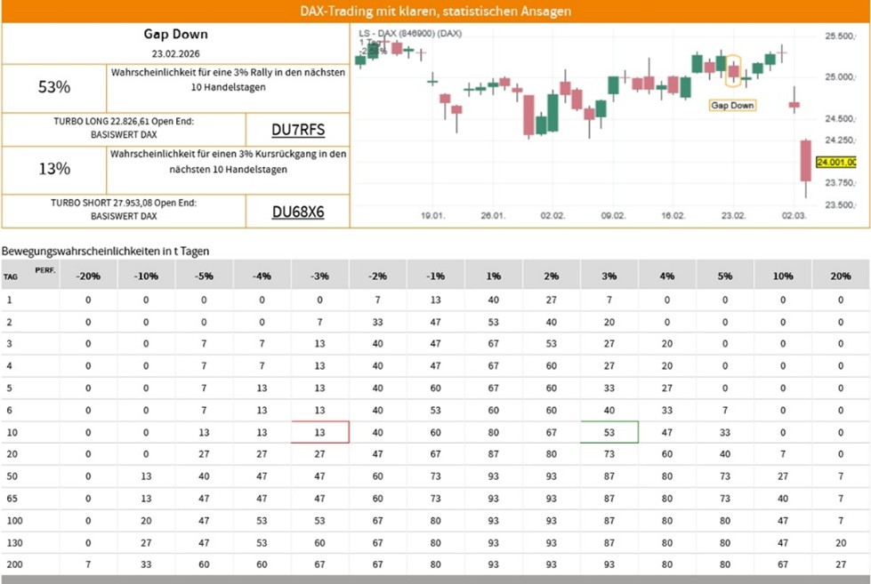 Die Erfolgswahrscheinlichkeiten für das Signal "Gap Down" beruhen auf einer historischen Auswertung des Signals auf den LS-DAX im Zeitraum vom 02.01.2000 bis zum 03.03.2026. Dabei wurden die folgenden Voreinstellungen und Filter vorgenommen: