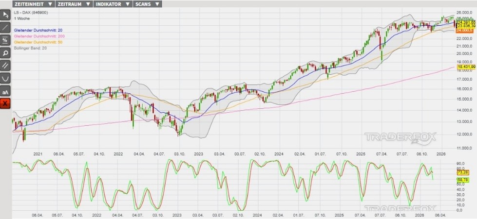 Charttechnisch hat der DAX an den letzten drei Handelstagen eine sich beschleunigende Abwärtsdynamik präsentiert. Hierbei ist der Index vom temporär überkauften Bereich über dem oberen Bollinger-Band bis in den überverkauften Bereich unter das untere Bollinger-Band gefallen. Diese bearishe Kursreaktion hat wiederum Verkaufssignale durch das Unterschreiten der gleitenden Durchschnitte der letzten 20, 50 sowie 200 Börsentage (= GD 20, GD 50 sowie GD 200) und eines in der Slow Stochastik ausgelöst.