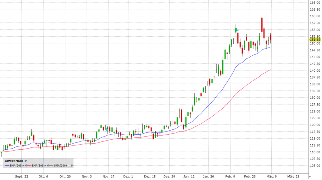 Der Hauptgrund für den Sprung von 120 auf fast 160 US-Dollar ist die geopolitische Krise. Da eine Sperrung der Straße von Hormus bis Ende März mit hoher Wahrscheinlichkeit eingepreist wird, wetten Anleger auf dauerhaft hohe Ölpreise über 90-100 US-Dollar. Der Chart zeigt eine beeindruckende Rallye, die sich seit Anfang Januar massiv beschleunigt hat. Nach einem neuen Allzeithoch bei 159,61 US-Dollar am 2. März sehen wir aktuell eine gesunde Konsolidierung. Exxon ist heute keine reine Öl-Wette mehr, sondern eine hocheffiziente "Cash-Maschine" mit massiven Rückzahlungen an die Aktionäre.