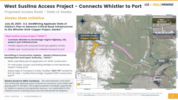Ein Schlüsselfaktor für Whistler ist die geplante West Susitna Access Road (WSAR). Hier hat Alaska bereits 2022 8,5 Mio. USD in detaillierte Planung, Baseline-Studien und Stakeholder-Arbeit investiert. Die Umsetzung ist in zwei Abschnitte geteilt: