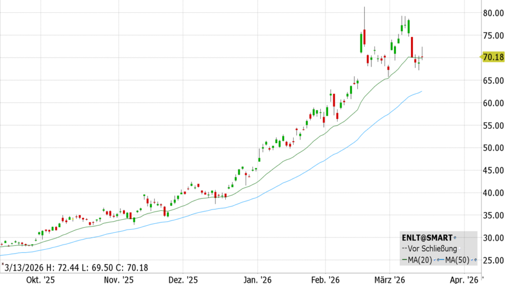 Enlight Renewable Energy ist ein börsennotiertes israelisches Unternehmen, das Solar- und Windkraftanlagen im Industriemaßstab entwickelt, finanziert, baut und betreibt. Neben klassischen Erzeugungsprojekten entwickelt es auch Batteriespeicher sowie sogenannte Agrivoltaik-Projekte, die Solaranlagen und Landwirtschaft auf derselben Fläche kombinieren. Seit 2023 gibt es schwarze Zahlen, zuletzt auf Rekordniveau. Im zweiten Quartal 2025 brach die Aktie aus einer längeren Seitwärtsbewegung aus und orientierte sich meist am 20er-EMA. Der aktuelle Rücksetzer zur grünen Linie könnte als Startpunkt eines Long Trades dienen.