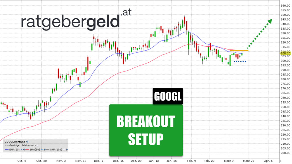 Alphabet-Aktie: Chart vom 17.03.2026, Kürzel: GOOGL, Kurs: 308.10 USD, Tageschart Quelle: TWS