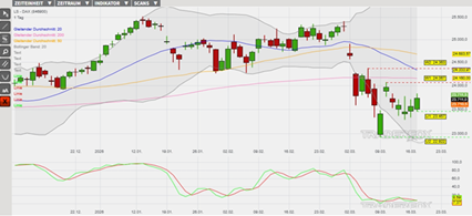 Der DAX hat nach dem panischen Abverkauf im Zeitraum vom 27. Februar bis zum 9. März die Basis für die Fortsetzung des langfristigen Aufwärtstrends gelegt. Erste Erholungstendenzen haben dazu beigetragen, dass am 13. März ein höheres Verlaufstief bei 23.287 Punkten im Chart etabliert werden konnte. Nach einem Inside-Day am Montag konnte dann am Dienstag eine Tageskerze mit einem höheren Tageshoch und -tief ausgebildet werden. Diese positive Kursreaktion hat außerdem ein Kaufsignal in der überverkauften Slow Stochastik ausgelöst. Es wurde getriggert, als die grüne Signallinie des Oszillators über die rote Signallinie gestiegen ist. Ein weiteres Kaufsignal könnte in den kommenden Tagen entstehen, wenn der gleitende Durchschnitt der letzten 200 Börsentage (= GD 200) nachhaltig überboten wird. Derzeit weisen derweil noch die gleitenden Durchschnitte der letzten 20, 50 sowie 200 Börsentage belastende Verkaufssignale aus. Im Szenario einer Fortsetzung des übergeordneten Aufwärtstrends könnte der DAX zunächst das Tageshoch vom 10. März bei 24.067 Punkten (Widerstand 1) ins Visier nehmen. Der Kursanstieg über dieses Hindernis könnte Anschlusskäufe bis zum lokalen Maximum vom 5. März bei 24.363 Punkten (Widerstand 2) auslösen. Impulse erwarten die Anleger heute unter anderem durch den Erzeugerpreisindex aus den USA. Vorbörslich wird der DAX mit einem Kursanstieg von +0,7 % getaxt. Das Long-Szenario ist hinfällig, wenn der DAX unter die Marke von 22.922 Punkten (Unterstützung 2) fällt.