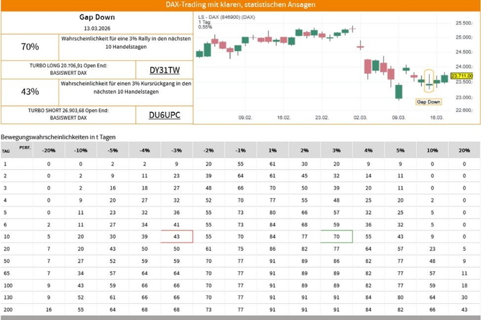 Die Erfolgswahrscheinlichkeiten für das Signal "Gap Down" beruhen auf einer historischen Auswertung des Signals auf den LS-DAX im Zeitraum vom 02.01.2000 bis zum 17.03.2026. Dabei wurden die folgenden Voreinstellungen und Filter vorgenommen: