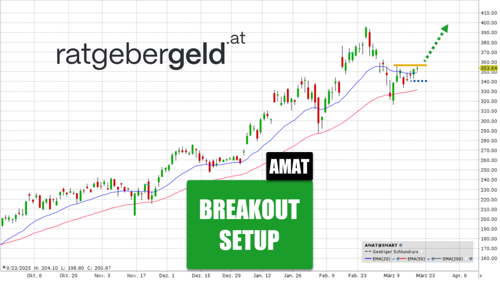 Applied Materials ist als Anbieter von Anlagen für die Halbleiterproduktion ein zentraler Profiteur des aktuellen KI-Booms. Die Aktie befindet sich in einem etablierten Aufwärtstrend. Nach dem Erreichen eines Rekordhochs bei fast 396 US-Dollar sehen wir nach einem Rücksetzer die Konsolidierung der Aktie.