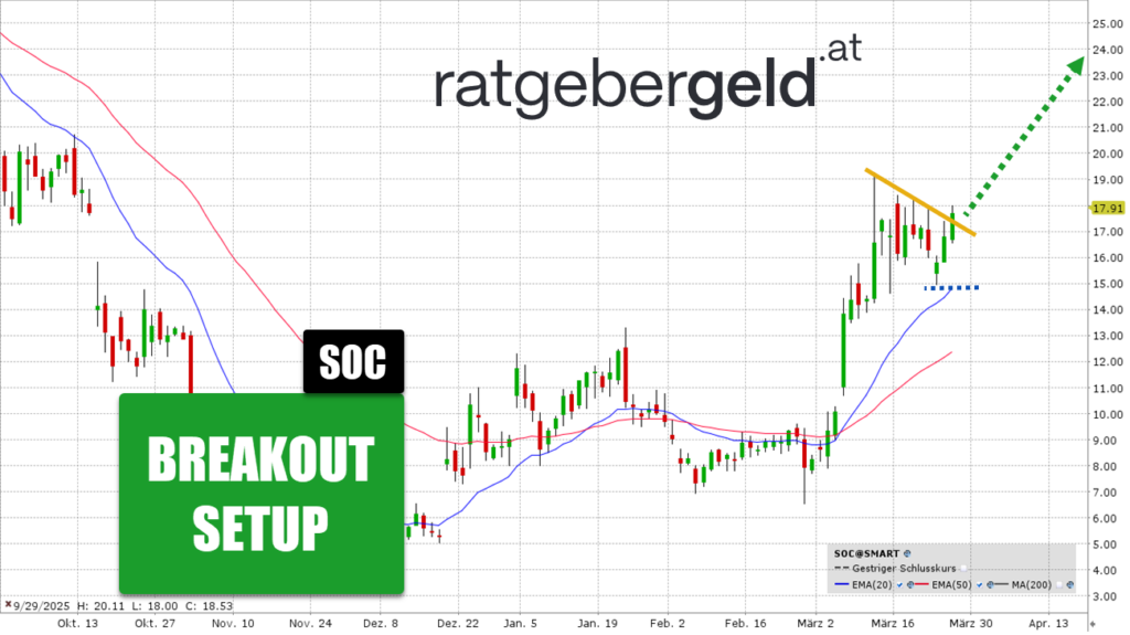 Nach einer Seitwärtsphase gab es von Anfang März bis Mitte März einen massiven Kursanstieg. Seit dem Hoch bei 19 USD korrigiert die Aktie aus dem Energiesektor über die Zeitachse. Gestern wurde die Abwärtstrendlinie überschritten.