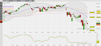 Gelingt es, den von vielen institutionellen Anlegern stark beachteten Gleitenden Durchschnitt der letzten 20 Handelstage (GD 20), der aktuell bei 23.511 Punkten (Widerstand 1) notiert, zu überwinden, könnte sich die am 23. März außerhalb des unteren Bollinger-Bands gestartete Erholungsbewegung weiter fortsetzen. Wird auch dieser Widerstand auf Schlusskursbasis erfolgreich überwunden, könnte der DAX im Anschluss das Tageshoch vom 10. März bei 24.067 Zählern (Widerstand 2) ansteuern. Als eine Anlagemöglichkeit in den DAX stehen verschiedene derivative Produkte zur Verfügung. Ein Beispiel ist der ENDLOS TURBO LONG 20.729,63 OPEN END: BASISWERT DAX der DZ BANK (WKN: DY31TW)* mit einem Basispreis von 20.729,63 Punkten. Der Hebel liegt am 27.03.2026 um 07:00 Uhr bei rund 11,84. Das Long-Szenario ist hinfällig, wenn der DAX nachhaltig unter die Unterstützung bei 21.860 Punkten (Unterstützung 2) fällt. Bitte beachten Sie die Produktrisiken, welche unten im Dokument beschrieben sind.