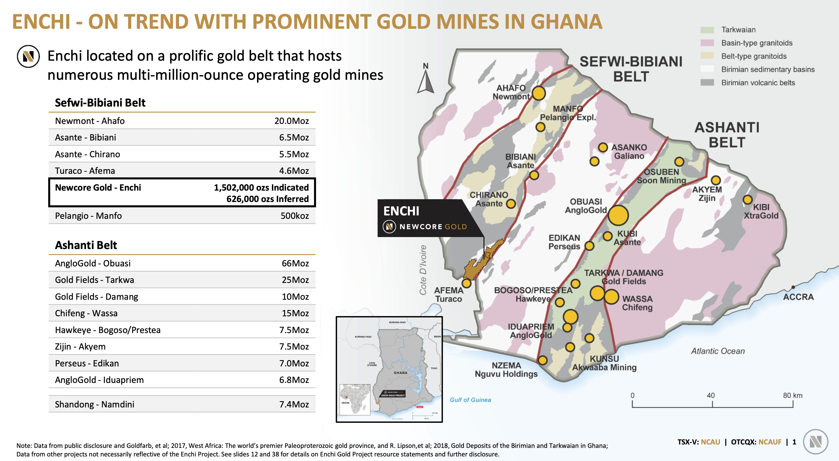Wichtig zum Kontext: Basierend auf aktuellen metallurgischen Daten verwendet die laufende PFS nicht mehr den bisherigen Heap-Leach-Ansatz, sondern setzt stattdessen ein Standard-Verarbeitungsschema mit Mahlung und Carbon-in-Leach (CIL). Newcore verweist auf Testausbeuten zwischen 89,4% und 97,7%, was auf ein Entwicklungsszenario hindeutet, das potenziell wertvoller und technisch robuster ist. Enchi erstreckt sich über 248 km² entlang eines etwa 40 Kilometer langen Abschnitts der Bibiani-Scherzone und liegt auf einem bekannten Goldtrend mit mehreren großen Lagerstätten in der Region.