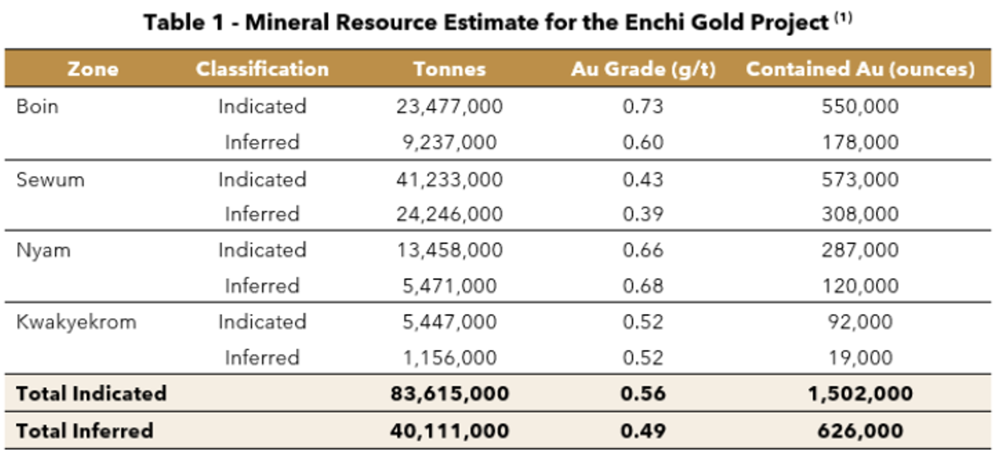 Am 18. März 2026 legte Newcore Gold (WKN: A2QATA) eine aktualisierte Mineralressourcenschätzung für Enchi vor, mit 1,502 Millionen Unzen Gold in der Kategorie "Indicated" und 626.000 Unzen Gold in der Kategorie "Inferred". Im Vergleich zur vorherigen Mineralressourcenschätzung stellt dies einen bedeutenden Fortschritt dar, insbesondere in der höhergradigen Kategorie "Indicated".