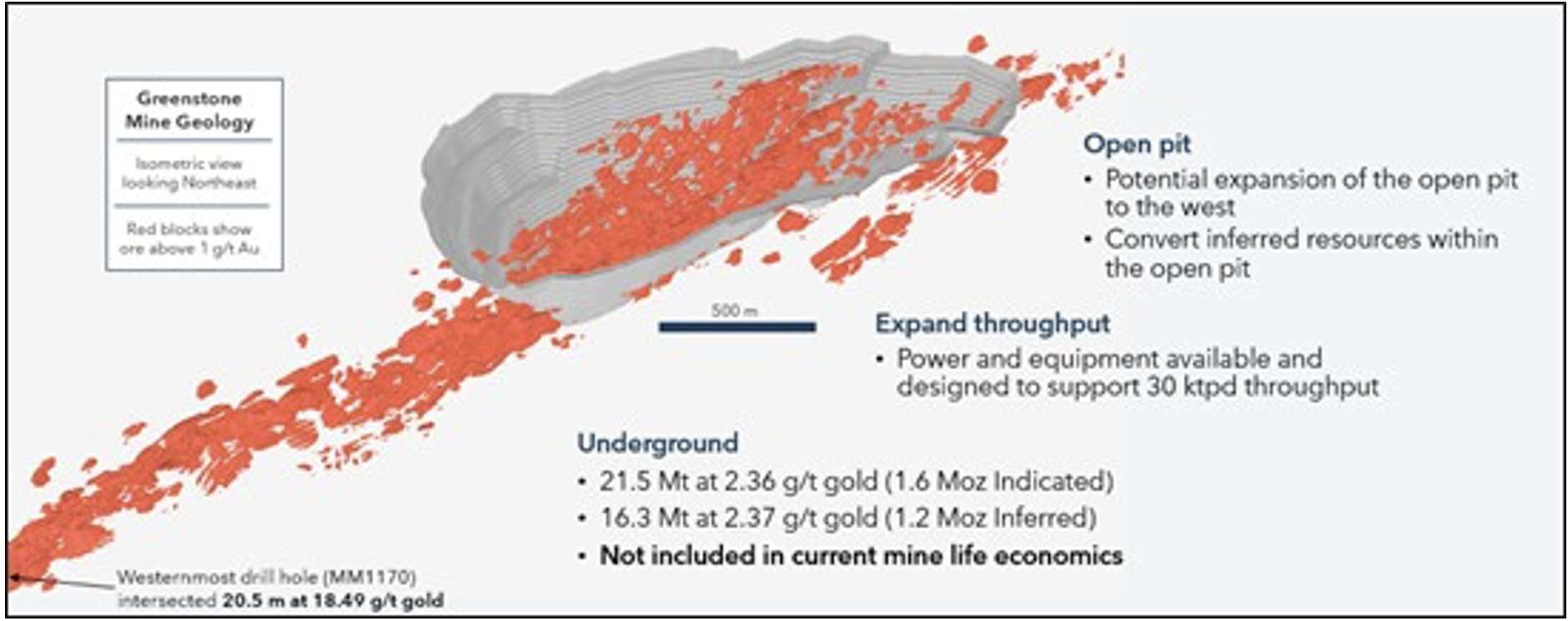 Darüber hinaus bietet "Greenstone' zahlreiche Möglichkeiten sowohl zur Steigerung der Produktion als auch zur Verlängerung der Lebensdauer der Mine. Explorationsarbeiten im Westen und Südwesten deuten auf ein gutes Ausbaupotenzial für den Tagebau hin. Eine große Untertage-Lagerstätte, die im aktuellen Reserven-Lebensdauerplan nicht berücksichtigt ist, weist auf ein mögliches zusätzliches Ausbaupotenzial hin.