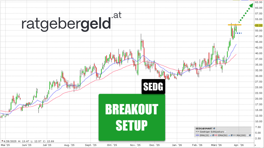 Nach einer Verschnaufpause befindet sich die Solar-Aktie in einem Aufwärtstrend, welcher sich zuletzt beschleunigte. Die Kurse notieren deutlich über dem EMA 20, was das bullische Momentum bestätigt.