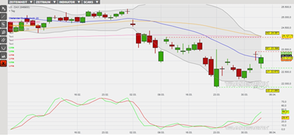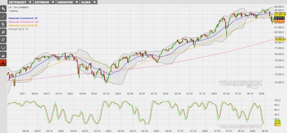 Der DAX präsentierte sich am Donnerstag vor dem langen Osterwochenende schwächer. Nach dem US-Präsident Donald Trump in seiner Rede zur Lage der Nation seine harte Linie gegen den Iran bekräftigt und im Falle einer weiteren Besetzung der Straße von Hormus mit Angriffen auf die iranische Energie-Infrastruktur gedroht hatte, war der DAX zunächst mit deutlichen Abschlägen gestartet. Nach einer behaupteten Handelseröffnung der Wall Street konnte sich der Deutsche Leitindex im weiteren Verlauf jedoch stabilisieren und ging mit einem marginalen Abschlag von -0,3% in die Osterpause. Damit wurde das übergeordnete bullische Szenario eindrucksvoll bestätigt. Gelingt es den Bullen nun erneut, Kaufdruck aufzubauen, sollte der DAX im weiteren Verlauf nun die Marke von 23.398 Punkten (Widerstand 1) ins Visier nehmen. Wird auch dieser Widerstand auf Schlusskursbasis überwunden, wären im Anschluss Zugewinne bis in den Bereich der Marke von 24.067 Punkten (Widerstand 2) denkbar. Am heutigen Dienstag stehen am Morgen unter anderem die Daten zum S&P-Einkaufsmanager-Index (Deutschland und EU) auf der Agenda. Am Nachmittag warten die Investoren gespannt auf die wöchentlichen Daten zum US-Auftragseingang langlebiger Güter. Der DAX wird vorbörslich mit einem Kursrückgang von -0,5 % getaxt. Das Long-Szenario ist hinfällig, wenn der DAX unter die Marke von 21.860 Punkten (Unterstützung 2) fällt.