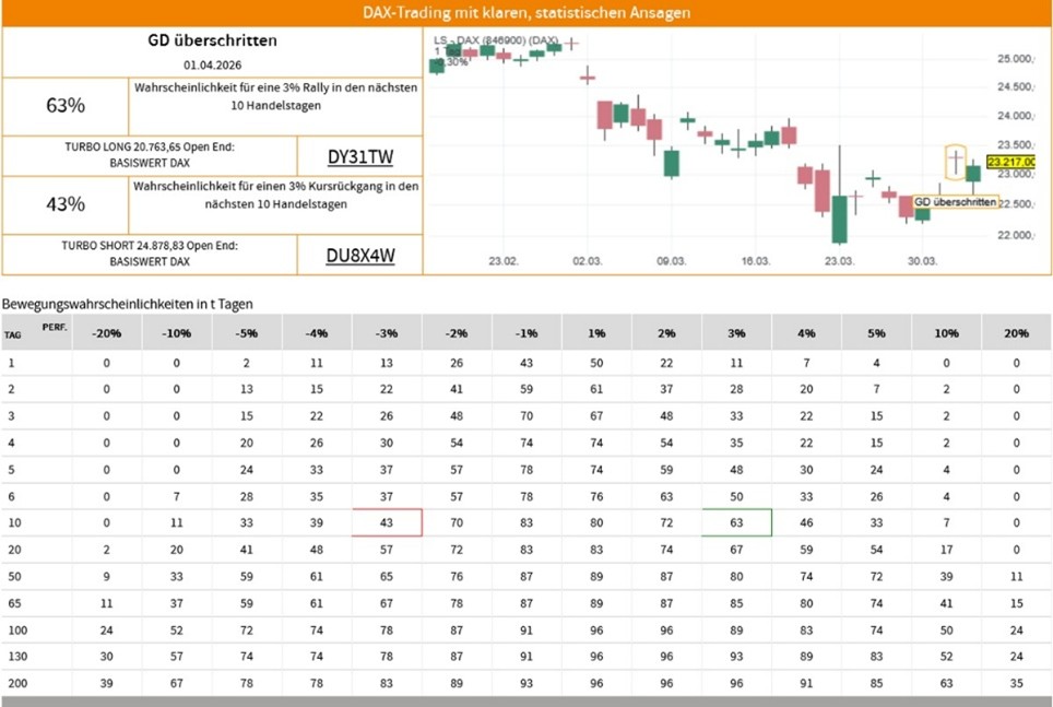 Die Erfolgswahrscheinlichkeiten für das Signal "GD überschritten" beruhen auf einer historischen Auswertung des Signals auf den LS-DAX im Zeitraum vom 02.01.2000 bis zum 02.04.2026. Dabei wurden die folgenden Voreinstellungen und Filter vorgenommen: