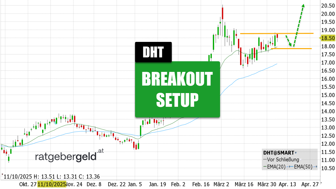 Rückblick: Ein Kursplus von 59 Prozent in einem intakten Aufwärtstrend sowie ein Breakout-Setup oberhalb der gleitenden Durchschnitte prägen das Chartbild der DHT-Holdings-Aktie. Aufgrund der Nachrichtenlage rund um die Straße von Hormuz sind weitere Kurssteigerungen nicht ganz unwahrscheinlich.