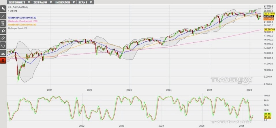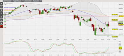 In Verbindung mit dem weiter bestehenden Long-Signal in der Slow-Stochastik könnte der DAX nun am Mittwoch das gestrige Tageshoch bei 23.408 Punkten (Widerstand 1) ins Visier nehmen. Wird auch diese Marke auf Schlusskursbasis erfolgreich überwunden, wären im Anschluss Zugewinne bis in den Bereich der Marke von 24.067 Zählern (Widerstand 2) möglich. Als eine Anlagemöglichkeit in den DAX stehen verschiedene derivative Produkte zur Verfügung. Ein Beispiel ist der ENDLOS TURBO LONG 20.763,65 OPEN END: BASISWERT DAX der DZ BANK (WKN: DY31TW)* mit einem Basispreis von 20.763,65 Punkten. Der Hebel liegt am 08.04.2026 um 07:00 Uhr bei rund 9,40. Das Long-Szenario ist hinfällig, wenn der DAX nachhaltig unter die Unterstützung bei 21.860 Punkten (Unterstützung 2) fällt. Bitte beachten Sie die Produktrisiken, welche unten im Dokument beschrieben sind.