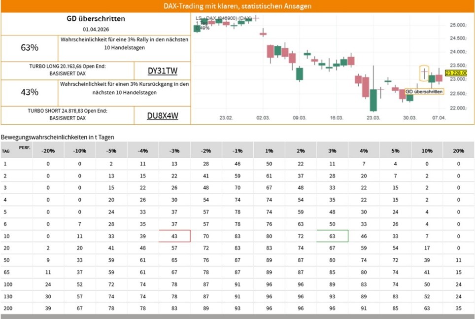 Die Erfolgswahrscheinlichkeiten für das Signal "GD überschritten" beruhen auf einer historischen Auswertung des Signals auf den LS-DAX im Zeitraum vom 02.01.2000 bis zum 07.04.2026. Dabei wurden die folgenden Voreinstellungen und Filter vorgenommen: