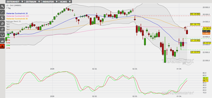 Nachdem der DAX am Mittwoch nach einem Gap-Up zu Handelsbeginn nach einer fulminanten Rally mit einem Kursplus am oberen Ende des Bollinger-Bands geschlossen hatte, musste der DAX am gestrigen Donnerstag deutlich schwächer aus dem Handel gehen. Damit konnten die Kursavancen der Bullen erfolgreich abgewehrt werden. Die Tatsache, dass der DAX nach dem gestrigen Rücksetzer wieder unterhalb der Gleitenden Durchschnitte der letzten 50 und der letzten 200 Handelstage (GD 50 und GD 200) notiert, zeigt, dass die Bären kurzfristig weiter am Drücker bleiben dürften.