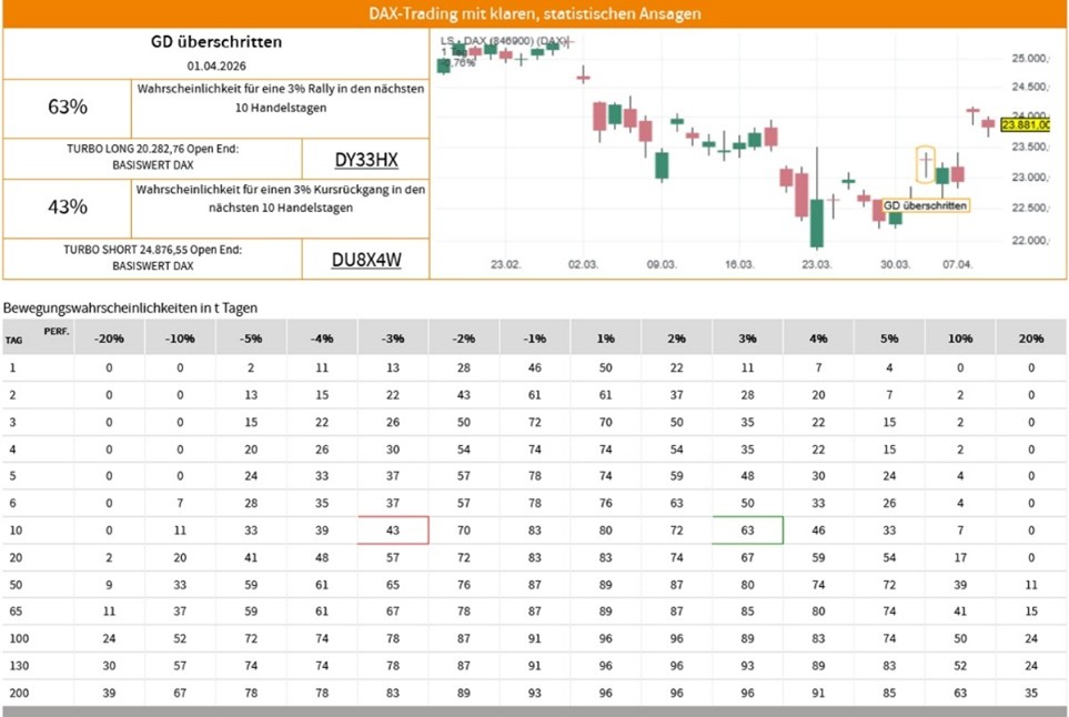 Die Erfolgswahrscheinlichkeiten für das Signal "GD überschritten" beruhen auf einer historischen Auswertung des Signals auf den LS-DAX im Zeitraum vom 02.01.2000 bis zum 09.04.2026. Dabei wurden die folgenden Voreinstellungen und Filter vorgenommen: