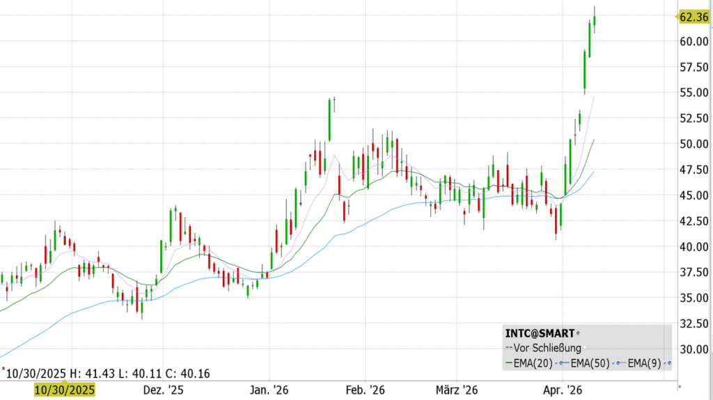 Intel wurde 1968 von Gordon Moore und Robert Noyce gegründet und hat seinen Hauptsitz in Santa Clara, Kalifornien. Der Hersteller von Halbleitern und Mikroprozessoren ist insbesondere bekannt für seine x86-Prozessoren für PCs und Server sowie Technologien in den Bereichen Cloud Computing, künstliche Intelligenz und autonomes Fahren. Nach drei Verlustjahren wird für 2026/27 wieder ein Gewinn erwartet. Ein Aufwärtstrend mit einem Halbjahresplus von 71 Prozent signalisiert, dass Anleger dem US-Halbleiterhersteller wieder deutlich mehr zutrauen. Treiber des jüngsten Aufschwungs ist eine neu bekannt gegebene Kooperation im Rahmen von Elon Musks Terafab-Initiative. Intel steuert dabei seine umfangreiche Expertise in Technologie und Produktion bei, um groß angelegte Fertigungsanlagen für Hochleistungschips aufzubauen. Im Fokus steht die industrielle Herstellung maßgeschneiderter Halbleiterlösungen für Einsatzfelder wie Künstliche Intelligenz, Robotik und Raumfahrt.
