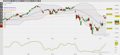 Ausgehend vom lokalen Minimum am 23. März bei 21.860 Punkten konnte der DAX vom überverkauften Bereich unterhalb des Bollinger-Bandes bis zum lokalen Maximum am 8. April bei 24.172 Punkten im überkauften Bereich über dem oberen Bollinger-Band steigen. Anschließend setzte eine technische Gegenreaktion zum Abbau der überkauften Situation ein. Sollte sich die Abwärtsbewegung ausweiten, dann könnten wir uns eine Kursrückkehr zum Tageshoch vom 7. April vorstellen. Durch die Berührung dieses Kursniveaus würde zugleich eine noch offene Kurslücke geschlossen werden. Bestätigt wird ein solches Szenario mit fallenden Kursnotierungen derzeit insbesondere durch die Verkaufssignale der gleitenden Durchschnitte der letzten 50 sowie 200 Börsentage (= GD 50 sowie GD 200). Eine Ausweitung der Kursrücksetzer könnte außerdem dazu beitragen, dass die überkauften Signallinien der Slow Stochastik wieder absinken. Sobald die grüne Signallinie des Oszillators wieder unter der roten Signallinie notiert, weist auch die Slow Stochastik ein belastendes Verkaufssignal aus.