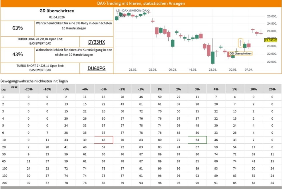 Die Erfolgswahrscheinlichkeiten für das Signal "GD überschritten" beruhen auf einer historischen Auswertung des Signals auf den LS-DAX im Zeitraum vom 02.01.2000 bis zum 09.04.2026. Dabei wurden die folgenden Voreinstellungen und Filter vorgenommen: