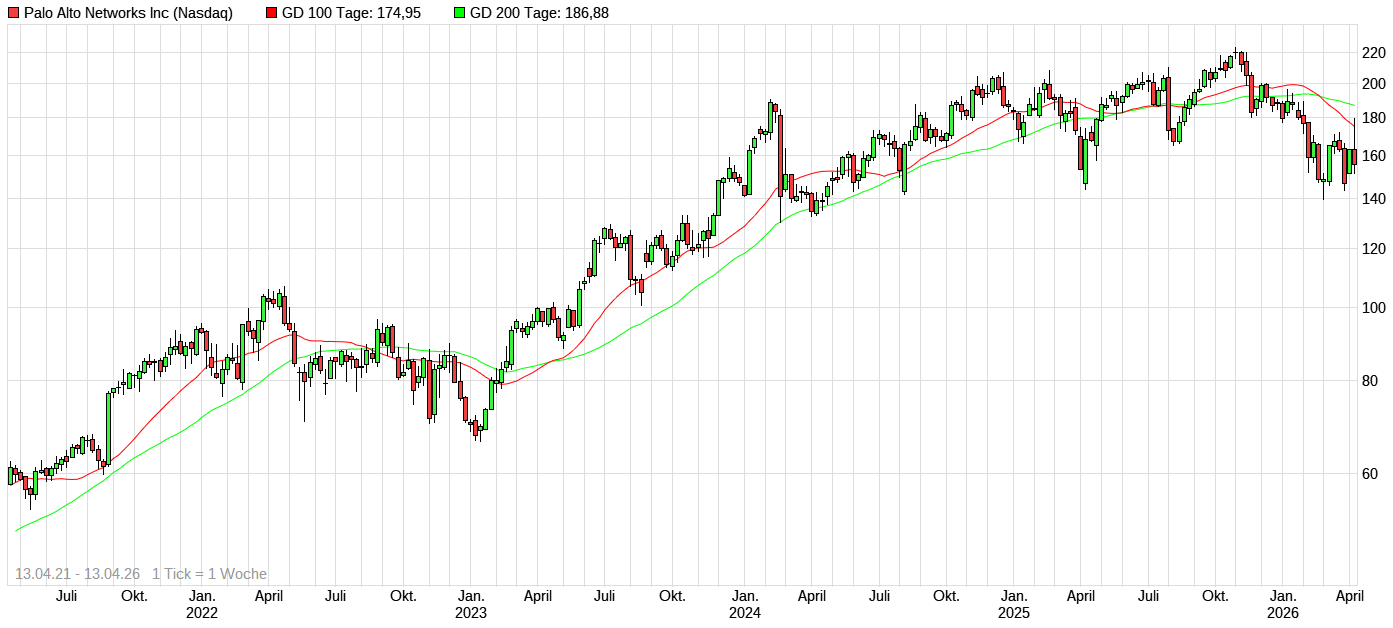 Nach dem jüngsten Rücksetzer notiert die Aktie von Palo Alto Networks aktuell im Bereich von rund 155,73 Dollar und damit klar unterhalb der wichtigen gleitenden Durchschnittslinien. Die 100 Tage Linie verläuft derzeit bei etwa 178 Dollar und die 200 Tage Linie bei rund 188 Dollar, was das angeschlagene technische Bild im mittelfristigen und langfristigen Zeitfenster unterstreicht.