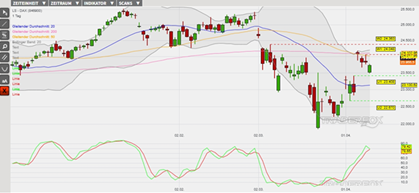 Die Stochastik ist ein mathematisches Verfahren zur Berechnung von Wahrscheinlichkeiten bei Zufallsverfahren. Mit dem Indikator der Slow Stochastik wird nach Umkehrpunkten im Markt gesucht. Charttechnische Relevanz erlangt der Indikator bei der Feststellung von Umkehrpunkten in Zeiten von Seitwärtsbewegungen und sich entwickelnden leichten Trends. Der Indikator sollte in Verbindung mit weiteren Indikatoren oder charttechnischen Mustern verwendet werden.