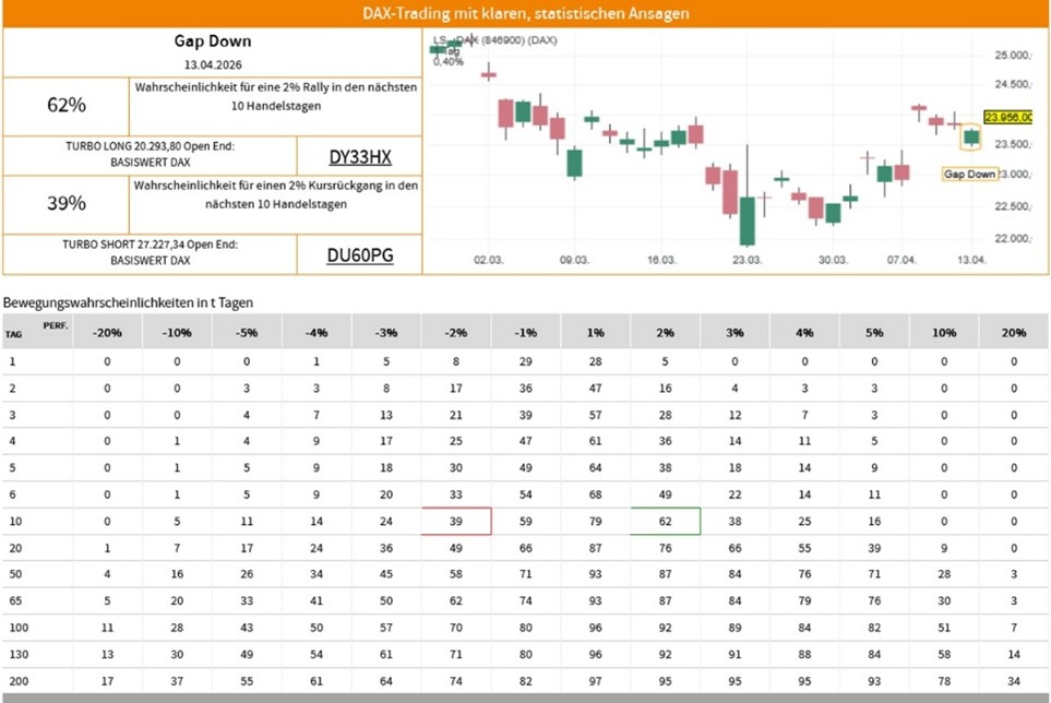 Charttechnisch könnte der DAX die untergeordnete Korrekturbewegung der letzten Handelstage durch die beiden Verkaufssignale und die Aussicht auf ein weiteres Verkaufssignal in der Slow Stochastik in den kommenden Tagen ausweiten. In diesem Szenario könnten wir uns einen Kursrückgang bis zum Tageshoch vom 7. April bei 23.408 Punkten (Unterstützung 1) vorstellen. Durch die Berührung dieser Kursmarke würde eine noch offene Kurslücke wieder geschlossen werden. Anschließend könnte sich die Abwärtsbewegung in Richtung des gleitenden Durchschnitts der letzten 20 Börsentage (= GD 20) ausweiten. Durch den nachhaltigen Kursrückgang unter den GD 20 würde ein weiteres Verkaufssignal getriggert werden, welches Anschlussverkäufe bis zum lokalen Minimum vom 2. April bei 22.670 Punkten (Unterstützung 2) begünstigen könnte. Als eine Anlagemöglichkeit in den DAX stehen verschiedene derivative Produkte zur Verfügung. Ein Beispiel ist der ENDLOS TURBO SHORT 27.227,34 OPEN END: BASISWERT DAX der DZ BANK (WKN: DU60PG)* mit einem Basispreis von 27.227,34 Punkten. Der Hebel liegt am 14.04.2026 um 07:00 Uhr bei 7,28. Das Short-Szenario ist hinfällig, wenn der DAX über die Marke von 24.363 Punkten (Widerstand 2) steigt. Bitte beachten Sie die Produktrisiken, welche unten im Dokument beschrieben sind.