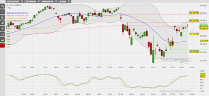 Der DAX hat am 23. März ein Mehrmonatstief im überverkauften Bereich unterhalb des Bollinger-Bandes markiert. Anschließend konnte der Index eine dynamische Aufwärtsbewegung absolvieren, wodurch steigende Verlaufstiefs am 30. März, 2. April und 13. April die Basis für eine Aufwärtstrendstruktur legen konnten. Bis zum 16. April ist es außerdem gelungen, mehrere charttechnische Kaufsignale zu triggern. Hervorzuheben sind insbesondere die Kaufsignale der gleitenden Durchschnitte der letzten 20, 50 sowie 200 Börsentage (= GD 20, GD 50 sowie GD 200) und eines in der mittlerweile überkauften Slow Stochastik. Obendrein weiten sich die Bollinger-Bänder aus, wodurch weiteres Kurspotenzial freigelegt werden könnte. Hierauf aufbauend erwarten wir in den kommenden Tagen eine Ausweitung der laufenden Aufwärtsbewegung. Das erste Hindernis lokalisieren wir dabei am Verlaufshoch vom 5. März bei 24.363 Punkten (Widerstand 1). Der Kursanstieg über diese Barriere könnte weitere Kursanstiege bis zum Tageshoch vom 2. März bei 24.892 Punkten (Widerstand 2) begünstigen. Impulse erwarten die Anleger vor dem Wochenende insbesondere durch die laufende Berichtssaison der Unternehmen und durch potenzielle geopolitische Neuigkeiten. Vorbörslich wird der DAX mit einem Kursanstieg von +0,1 % getaxt. Das Long-Szenario ist hinfällig, wenn der DAX unter die Marke von 22.670 Punkten (Unterstützung 2) fällt.