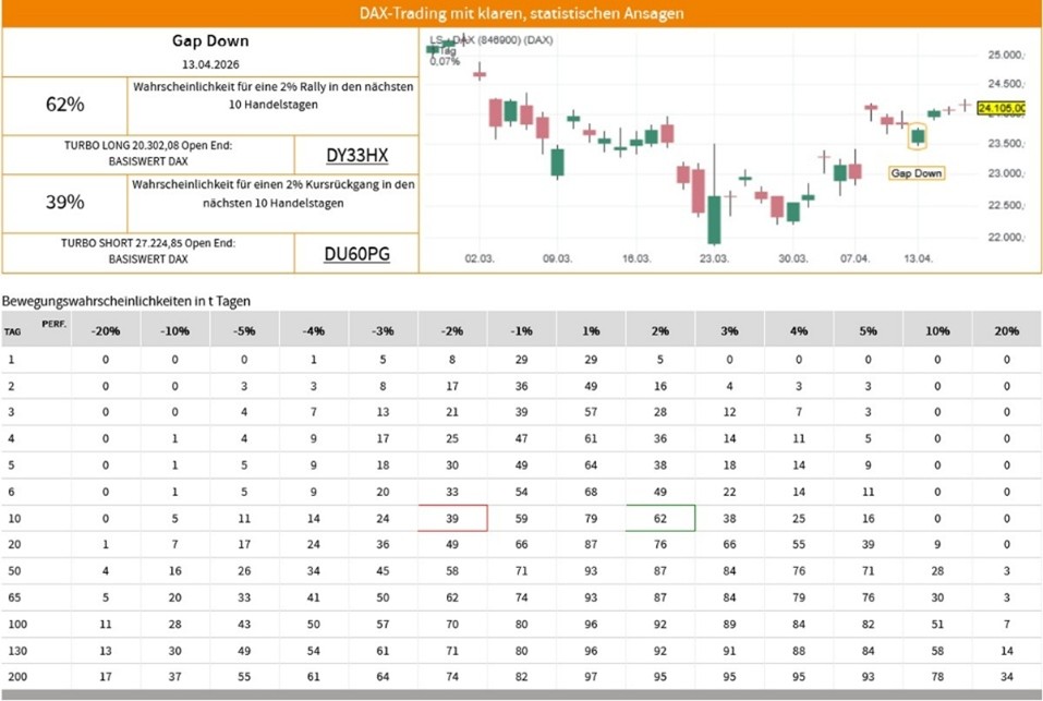 Die Erfolgswahrscheinlichkeiten für das Signal "Gap Down" beruhen auf einer historischen Auswertung des Signals auf den LS-DAX im Zeitraum vom 02.01.2000 bis zum 16.04.2026. Dabei wurden die folgenden Voreinstellungen und Filter vorgenommen: