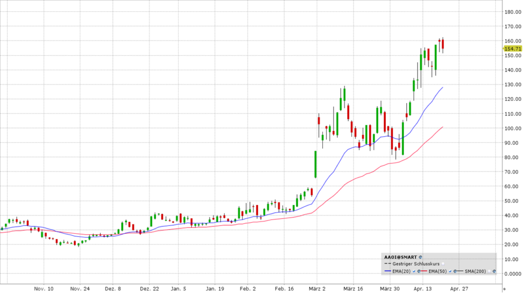 AAOI ist der "Schaufelverkäufer" im KI-Goldrausch. Für die riesigen KI-Rechenzentren werden extrem schnelle Verbindungen benötigt. AAOI hat gerade Großaufträge über 124 Mio. USD für 800G-Transceiver erhalten. Aktuell notiert die Aktie um die 154 USD. Die Volatilität ist jedoch extrem hoch - nichts für schwache Nerven! Die Story steht und fällt mit dem Ausbau der Hyperscale-Rechenzentren (Microsoft, Amazon). Die vollen Auftragsbücher stützen den Kurs.