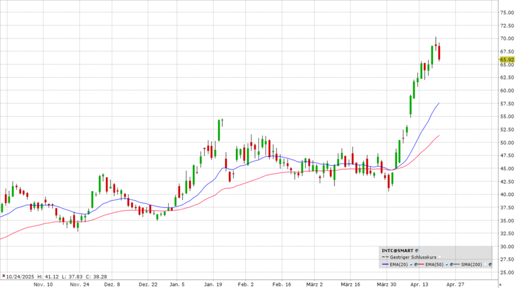 Intel befindet sich mitten in einem massiven Umbau. Das Unternehmen setzt alles auf seinen 18A-Fertigungsprozess, um technologisch wieder zu TSMC aufzuschließen. Während sie im KI-Chip-Bereich gegen Nvidia und AMD kämpfen, punktet Intel aktuell bei "AI PCs" (Core Ultra Serie), die für professionelle Workflows optimiert sind. Die Aktie hatte im April einen Rekord-Lauf. Nach einem Peak bei ca. 70 USD gab es zuletzt einen leichten Rücksetzer. Der Chart sieht etwas überhitzt aus. Ein Pullback zum EMA 20 könnte folgen.