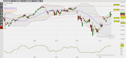 Nachdem der DAX am 17. April noch temporär bis in den überkauften Bereich über das obere Bollinger-Band gestiegen ist, setzte am 20. April eine technische Gegenreaktion ein. Es kam am Montag zu einem Gap-Down, welches wiederum ein Verkaufssignal in der überkauften Slow Stochastik ausgelöst hat. Das Verkaufssignal wurde getriggert, als die grüne Signallinie unter die rote Signallinie gesunken ist. Weitere Verkaufssignale könnten in den kommenden Tagen folgen, sofern der Index unter die gleitenden Durchschnitte der letzten 200 und 50 Börsentage (= GD 200 und GD 50) sinken sollte.