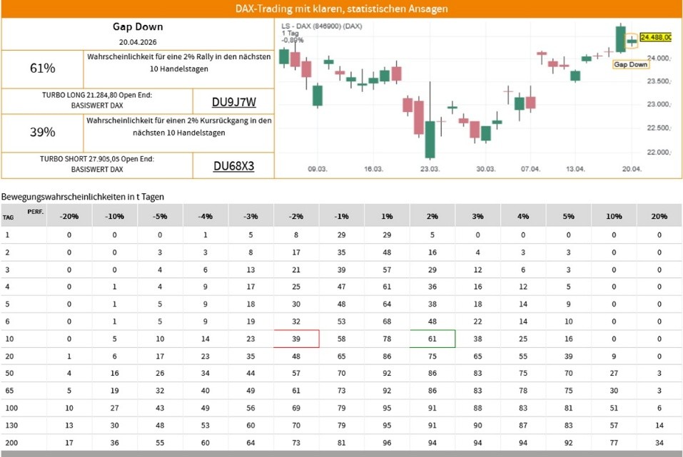 Die Erfolgswahrscheinlichkeiten für das Signal "Gap Down" beruhen auf einer historischen Auswertung des Signals auf den LS-DAX im Zeitraum vom 02.01.2000 bis zum 20.04.2026. Dabei wurden die folgenden Voreinstellungen und Filter vorgenommen: