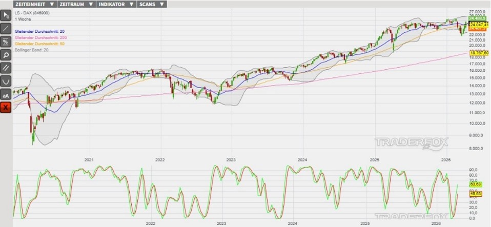 Sofern der DAX die Konsolidierung über der Supportzone des GD 50 und GD 200 als Basis für die Trendfortsetzung nutzen sollte, könnten wir uns weitere Kursanstiege vorstellen. Hierbei sehen wir die erste Barriere am Tageshoch vom 17. April bei 24.801 Punkten (Widerstand 1). Der Kursanstieg über dieses Hindernis könnte den Index zum sich ausweitenden, oberen Bollinger-Band und bis zum Allzeithoch vom 13. Januar bei 25.510 Punkten (Widerstand 2) führen. Der Kursanstieg auf neue Höchststände könnte wiederum ein weiteres, prozyklisches Kausignal erzeugen. Als eine Anlagemöglichkeit in den DAX stehen verschiedene derivative Produkte zur Verfügung. Ein Beispiel ist der ENDLOS TURBO LONG 21.284,80 OPEN END: BASISWERT DAX der DZ BANK (WKN: DU9J7W)* mit einem Basispreis von 21.284,80 Punkten. Der Hebel liegt am 21.04.2026 um 07:00 Uhr bei rund 7,66. Das Long-Szenario ist hinfällig, wenn der DAX nachhaltig unter die Unterstützung bei 23.759 Punkten (Unterstützung 2) fällt. Bitte beachten Sie die Produktrisiken, welche unten im Dokument beschrieben sind.