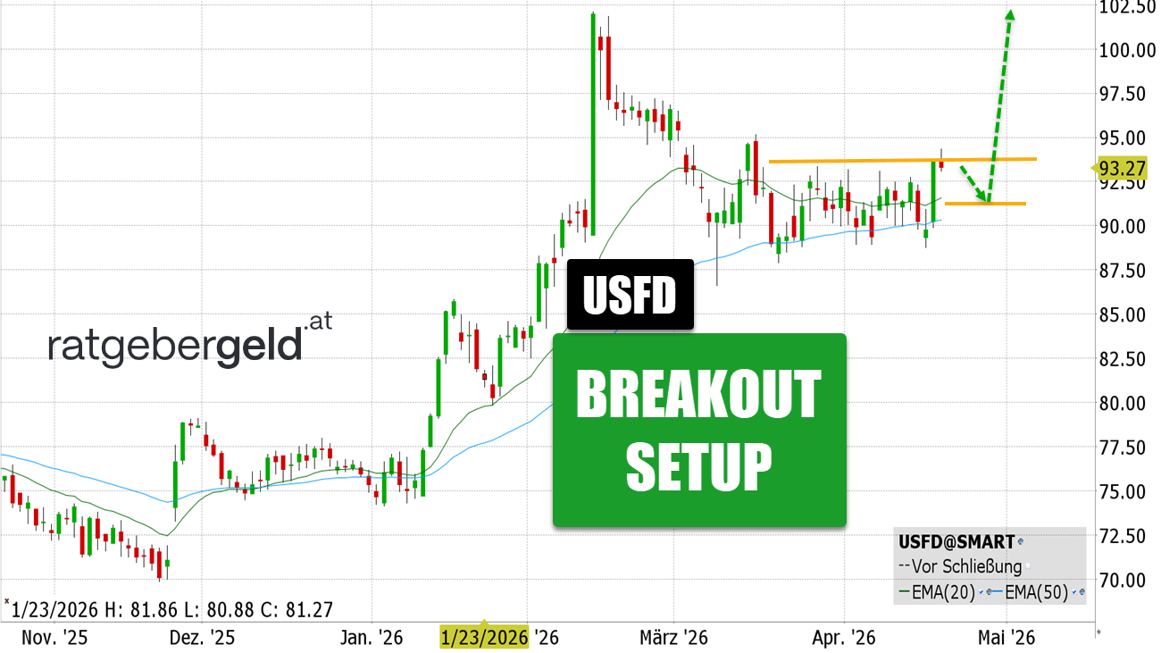 US-Food-Aktie: Chart vom 20.04.2026, Kürzel: USFD Kurs: 93.27 USD, Tageschart Quelle: TWS