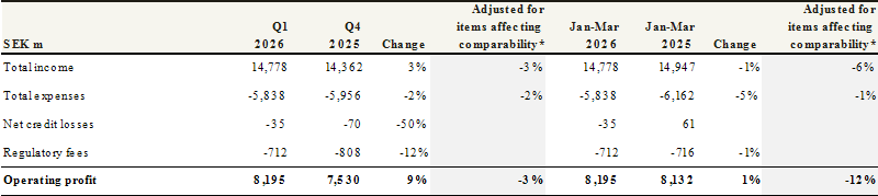 The greater focus on efficiency in recent years has reduced the running cost base at the Bank, offsetting both general inflation and the annual salary adjustments that come into effect at the start of every year. Compared with the previous quarter, expenses went down by 2%, while compared with the corresponding quarter during the previous year, expenses were down by 1% after adjustments for items affecting comparability. Credit quality remained strong with a credit loss ratio of 0.01%.