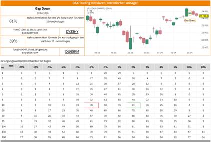Die Erfolgswahrscheinlichkeiten für das Signal "Gap Down" beruhen auf einer historischen Auswertung des Signals auf den LS-DAX im Zeitraum vom 02.01.2000 bis zum 22.04.2026. Dabei wurden die folgenden Voreinstellungen und Filter vorgenommen: