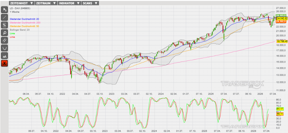 In unserem bevorzugten Szenario könnte zeitnah eine neue Aufwärtsbewegung eingeleitet werden. Hierbei lokalisiert das Tageshoch vom 21. April bei 24.606 Punkten (Widerstand 1) die erste Barriere. Der Kursanstieg über dieses Hindernis könnte Anschlusskäufe bis zum oberen Bollinger-Band auslösen. Die zweite Hürde notiert am Tagestief vom 27. Februar bei 25.184 Punkten (Widerstand 2). Durch die Berührung dieser Kursmarke würde wiederum eine noch offene Kurslücke wieder geschlossen werden. Als eine Anlagemöglichkeit in den DAX stehen verschiedene derivative Produkte zur Verfügung. Ein Beispiel ist der ENDLOS TURBO LONG 21.160,32 OPEN END: BASISWERT DAX der DZ BANK (WKN: DY33HY)* mit einem Basispreis von 21.160,32 Punkten. Der Hebel liegt am 23.04.2026 um 07:00 Uhr bei rund 7,89. Das Long-Szenario ist hinfällig, wenn der DAX nachhaltig unter die Unterstützung bei 23.408 Punkten (Unterstützung 2) fällt. Bitte beachten Sie die Produktrisiken, welche unten im Dokument beschrieben sind.