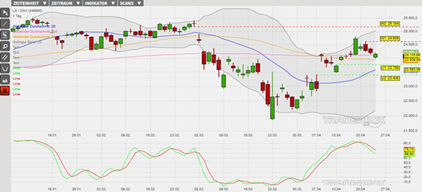 Charttechnisch konnte der DAX seit dem 23. März eine Aufwärtsbewegung absolvieren, wobei höhere Verlaufstiefs am 30. März, 2. April und 13. April im Chart etabliert wurden. Nach der technischen Gegenreaktion der letzten Handelstage könnte wiederum die Etablierung eines neuen, höheren Verlaufstiefs vorbereitet werden. Durch die Etablierung eines neuen lokalen Minimums könnte wiederum die Basis für die nächste Aufwärtswelle und damit für die Trendfortsetzung gelegt werden. Dieses Szenario präferieren wir momentan, weil es auch durch die Kaufsignale der gleitenden Durchschnitte der letzten 20, 50 sowie 200 Börsentage (= GD 20, GD 50 sowie GD 200) bestätigt wird. Obendrein weiten sich die Bollinger-Bänder nach oben aus. Lediglich die Slow Stochastik weist derzeit ein Verkaufssignal aus. Sollte allerdings die grüne Signallinie des Oszillators wieder über die rote Signallinie steigen, dann würde ein weiteres Kaufsignal getriggert werden. Die erste Hürde in unserem präferierten Szenario liegt am Tageshoch vom 21. April bei 24.606 Punkten (Widerstand 1). Der Kursanstieg über dieses Hindernis könnte Anschlusskäufe bis zum oberen Bollinger-Band und anschließend bis zum Tagestief vom 27. Februar bei 25.184 Punkten (Widerstand 2) auslösen. Durch die Berührung dieser Kursmarke würde wiederum eine noch offene Kurslücke wieder geschlossen werden. Impulse erwarten die Marktteilnehmer heute insbesondere durch die Kursreaktion vom Indexschwergewicht SAP nach der Präsentation der Fundamentaldaten sowie durch die Daten des ifo-Instituts zur aktuellen Lageeinschätzung und zum Geschäftsklimaindex für Deutschland. Vorbörslich wird der DAX mit einem Kursrückgang von -0,2 % getaxt. Das Long-Szenario ist hinfällig, wenn der DAX unter die Marke von 23.408 Punkten (Unterstützung 2) fällt.