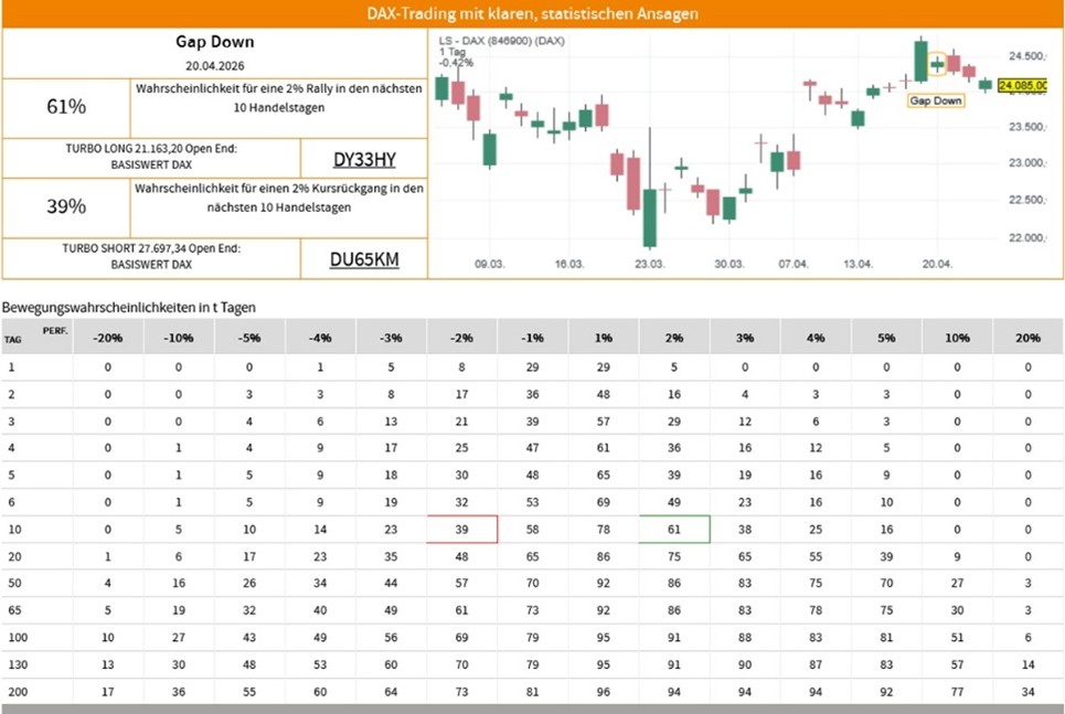 Die Erfolgswahrscheinlichkeiten für das Signal "Gap Down" beruhen auf einer historischen Auswertung des Signals auf den LS-DAX im Zeitraum vom 02.01.2000 bis zum 22.04.2026. Dabei wurden die folgenden Voreinstellungen und Filter vorgenommen: