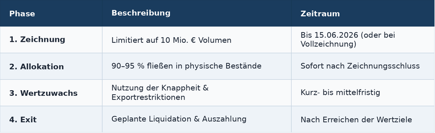 Die Zeichnungsfrist für die Primäremission ist auf den 15. Juni 2026 begrenzt - oder endet früher, sollte das limitierte Volumen von 10 Millionen Euro vorher vollständig gezeichnet sein. Für Anleger, die Rohstoffe als Geldanlage strategisch einsetzen und die aktuelle Knappheitsphase nutzen wollen, ist der Einstieg über den Primärmarkt die direkteste Option.