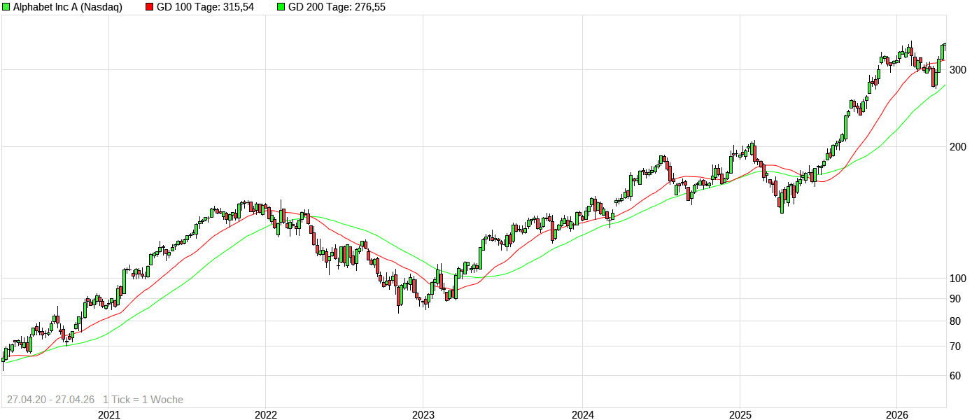Aus charttechnischer Sicht präsentiert sich das Papier weiter in beeindruckender Verfassung. Die Aktie notiert klar über dem gleitenden Durchschnitt der vergangenen 100 Tage bei 315 Dollar und ebenso deutlich über der 200-Tage-Linie bei 276 Dollar. Damit bleibt der mittel- und langfristige Aufwärtstrend intakt. Der nächste Prüfstein liegt am aktuellen Allzeithoch, das als zentrale Widerstandszone fungiert. Gelingt dort ein sauberer Ausbruch, könnte die laufende Rally in die nächste Phase übergehen. Auf der Unterseite bildet der Bereich um 270 Dollar die erste wichtige Unterstützung. Sollte der Wert deutlicher zurücksetzen, käme als übergeordnete Auffangzone der Bereich um 200 Dollar in den Blick. Solange Alphabet oberhalb der beiden langfristigen Durchschnittslinien notiert, bleibt das technische Bild konstruktiv.