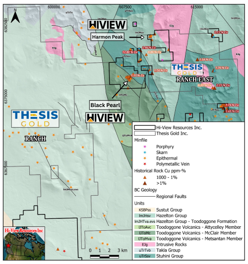 Denn laut Hi-View befindet sich Black Pearl in einer günstigen geologischen Stratigraphie, um potenzielle Porphyr-Mineralisierung zu beherbergen. Zusätzlich grenzt das Projekt an das bekannte Porphyry-Pearl-Showing, bei dem historische Bohrungen unter anderem 70 Meter mit 0,31% Kupfer, 0,12 g/t Gold und 2,8 g/t Silber lieferten.