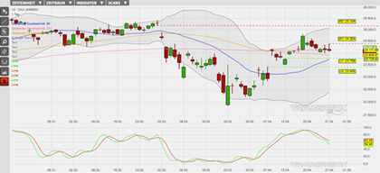 In den letzten Wochen hat der DAX eine untergeordnete Aufwärtstrendstruktur mit steigenden Verlaufstiefs am 30. März, 2. April, 13. April sowie 23. April im Chart etabliert. Nach dem Kursanstieg auf ein neues Monatshoch am 17. April folgte dabei eine aktuell laufende Konsolidierung. Wir sehen hierin die potenzielle Ausgangsbasis für eine Fortsetzung des Aufwärtstrends. Bestätigt wird dieses Szenario derzeit durch die Kaufsignale der gleitenden Durchschnitte der letzten 20 sowie 50 Börsentage (= GD 20 sowie GD 50). Weitere Kaufsignale könnten bei einsetzendem Kaufdruck durch das nachhaltige Überschreiten des gleitenden Durchschnitts der letzten 200 Börsentage (= GD 200) und in der Slow Stochastik entstehen. In diesem Szenario markiert das Tageshoch vom 27. April bei 24.384 Punkten (Widerstand 1) unsere erste Barriere. Sollte dieses Hindernis nachhaltig überboten werden, könnten Kursanstiege bis zum oberen Bollinger-Band und bis zum Tagestief vom 27. Februar bei 25.184 Punkten (Widerstand 2) folgen. Durch die Berührung dieses Kursniveaus würde wiederum eine noch offene Kurslücke wieder geschlossen werden. Impulse erwarten die Anleger heute durch das CB Verbrauchervertrauen für den Monat April. Vorbörslich wird der DAX mit einem Kursanstieg von +0,2 % getaxt. Das Long-Szenario ist hinfällig, wenn der DAX unter die Marke von 23.408 Punkten (Unterstützung 2) fällt.