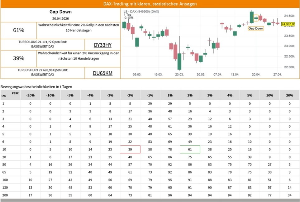 Die Erfolgswahrscheinlichkeiten für das Signal "Gap Down" beruhen auf einer historischen Auswertung des Signals auf den LS-DAX im Zeitraum vom 02.01.2000 bis zum 22.04.2026. Dabei wurden die folgenden Voreinstellungen und Filter vorgenommen: