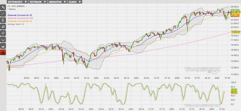 In unserem bevorzugten Szenario könnte die laufende Konsolidierung die Basis für eine neue Aufwärtswelle im intakten Aufwärtstrend legen. Hierbei lokalisieren wir die erste Hürde am Tageshoch vom 27. April bei 24.384 Punkten (Widerstand 1). Der Kursanstieg über diese Barriere könnte wiederum Anschlusskäufe bis zum oberen Bollinger-Band und danach bis zum Tagestief vom 27. Februar bei 25.184 Punkten (Widerstand 2) auslösen. Durch die Berührung dieser Kursmarke würde zugleich eine noch offene Kurslücke wieder geschlossen werden. Als eine Anlagemöglichkeit in den DAX stehen verschiedene derivative Produkte zur Verfügung. Ein Beispiel ist der ENDLOS TURBO LONG 21.174,72 OPEN END: BASISWERT DAX der DZ BANK (WKN: DY33HY)* mit einem Basispreis von 21.174,72 Punkten. Der Hebel liegt am 28.04.2026 um 07:00 Uhr bei rund 8,22. Das Long-Szenario ist hinfällig, wenn der DAX nachhaltig unter die Unterstützung bei 23.408 Punkten (Unterstützung 2) fällt. Bitte beachten Sie die Produktrisiken, welche unten im Dokument beschrieben sind.