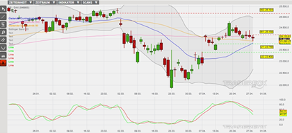 Wenn der DAX die aktuell laufende Konsolidierung für den Start einer neuen Aufwärtswelle nutzen sollte, könnte eine Trendfortsetzung forciert werden. In diesem Szenario markiert das Tageshoch vom 28. April bei 24.159 Punkten (Widerstand 1) die erste Barriere. Der Kursanstieg über diese Hürde könnte weitere Kursanstiege bis zum oberen Bollinger-Band und anschließend bis zum Tagestief vom 27. Februar bei 25.184 Punkten (Widerstand 2) auslösen. Durch die Berührung dieser Kursmarke würde zugleich eine noch offene Kurslücke wieder geschlossen werden. Als eine Anlagemöglichkeit in den DAX stehen verschiedene derivative Produkte zur Verfügung. Ein Beispiel ist der ENDLOS TURBO LONG 21.177,60 OPEN END: BASISWERT DAX der DZ BANK (WKN: DY33HY)* mit einem Basispreis von 21.177,60 Punkten. Der Hebel liegt am 29.04.2026 um 07:00 Uhr bei rund 8,47. Das Long-Szenario ist hinfällig, wenn der DAX nachhaltig unter die Unterstützung bei 23.408 Punkten (Unterstützung 2) fällt. Bitte beachten Sie die Produktrisiken, welche unten im Dokument beschrieben sind.