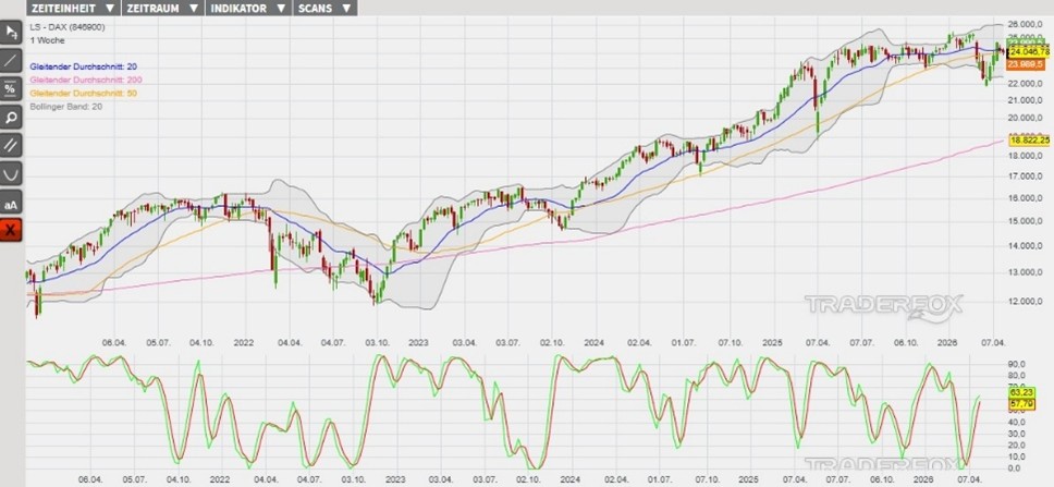 Im Szenario einer sich ausweitenden, technischen Gegenreaktion könnte der DAX in Richtung des Tageshochs vom 13. April bei 23.759 Punkten (Unterstützung 1) sinken. Die Berührung dieses Kursniveaus würde zugleich eine noch offene Kurslücke wieder schließen. Anschließend könnte sich die Abwärtsbewegung potenziell bis zum Tageshoch vom 7. April bei 23.408 Punkten (Unterstützung 2) ausweiten. Durch die Berührung dieses Kursniveaus würde eine weitere, noch offene Kurslücke wieder geschlossen werden. Als eine Anlagemöglichkeit in den DAX stehen verschiedene derivative Produkte zur Verfügung. Ein Beispiel ist der ENDLOS TURBO SHORT 27.693,14 OPEN END: BASISWERT DAX der DZ BANK (WKN: DU65KM)* mit einem Basispreis von 27.693,14 Punkten. Der Hebel liegt am 29.04.2026 um 07:00 Uhr bei 6,48. Das Short-Szenario ist hinfällig, wenn der DAX über die Marke von 25.184 Punkten (Widerstand 2) steigt. Bitte beachten Sie die Produktrisiken, welche unten im Dokument beschrieben sind.